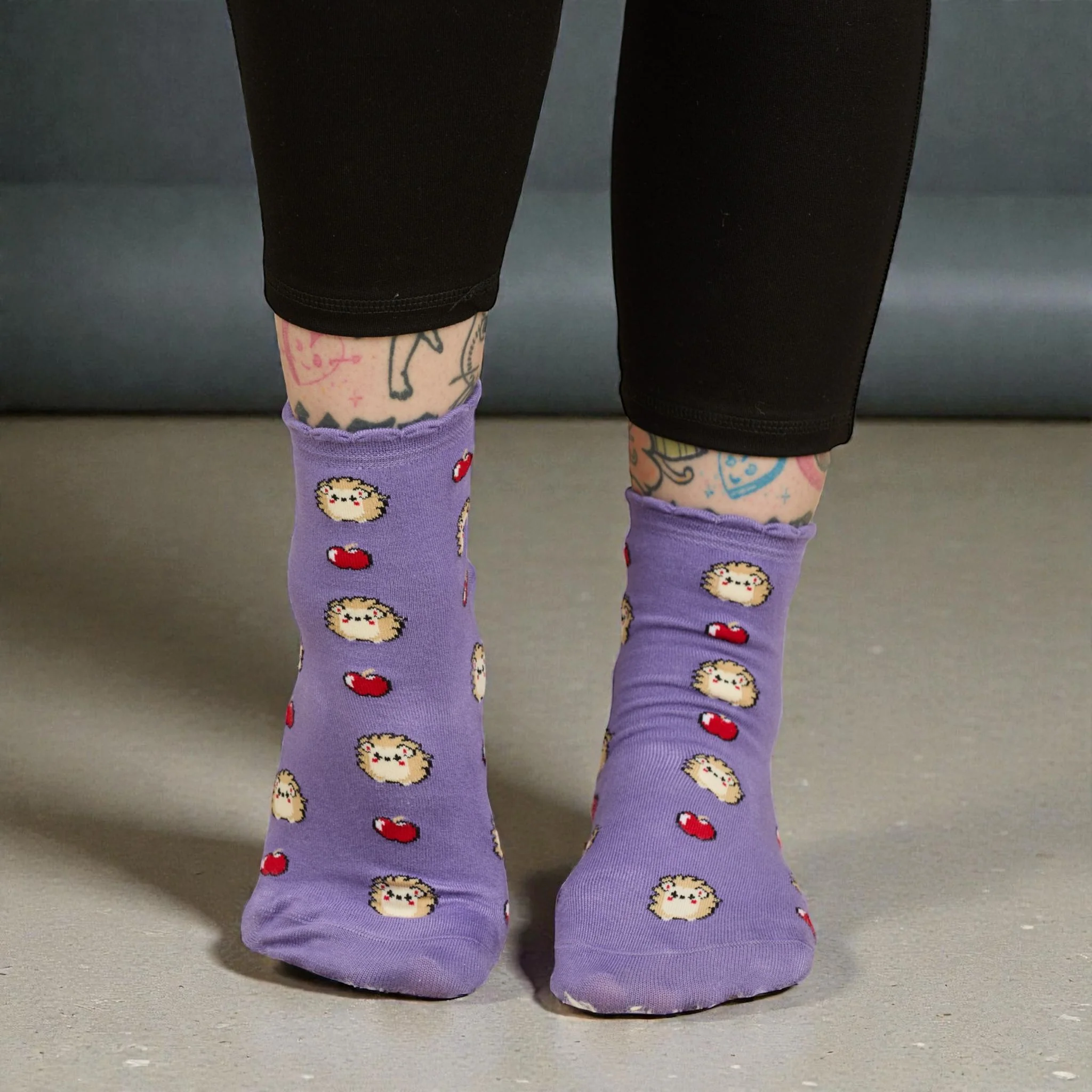 Tiny hedgehogs curled up with rosy red apples tumble across a gorgeous deep purple background, bringing just the right amount of woodland magic. Perfect for anyone who fancies the cosiest toes in the room.